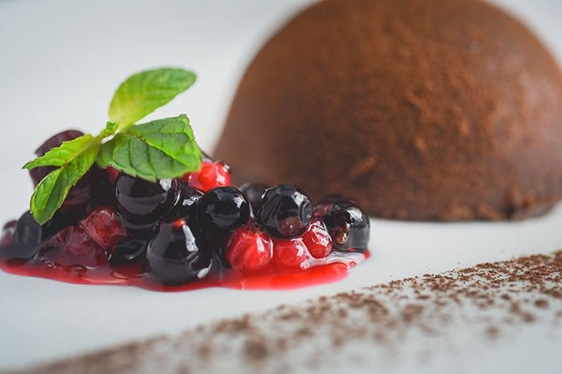 קינחנו במוס שוקולד בציפוי שוקולד מריר איכותי שמגיע על קראנץ' שקדים ורוטב פירות יער- שהיה לא פחות ממושלם וברולה פיסטוק אמרטו טעים טעים טעים.