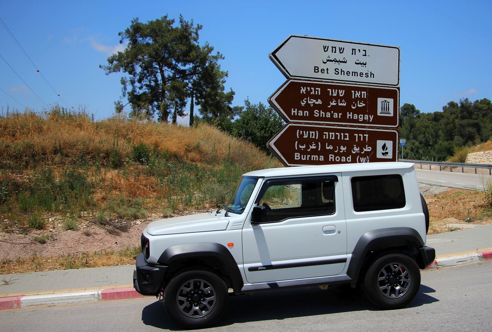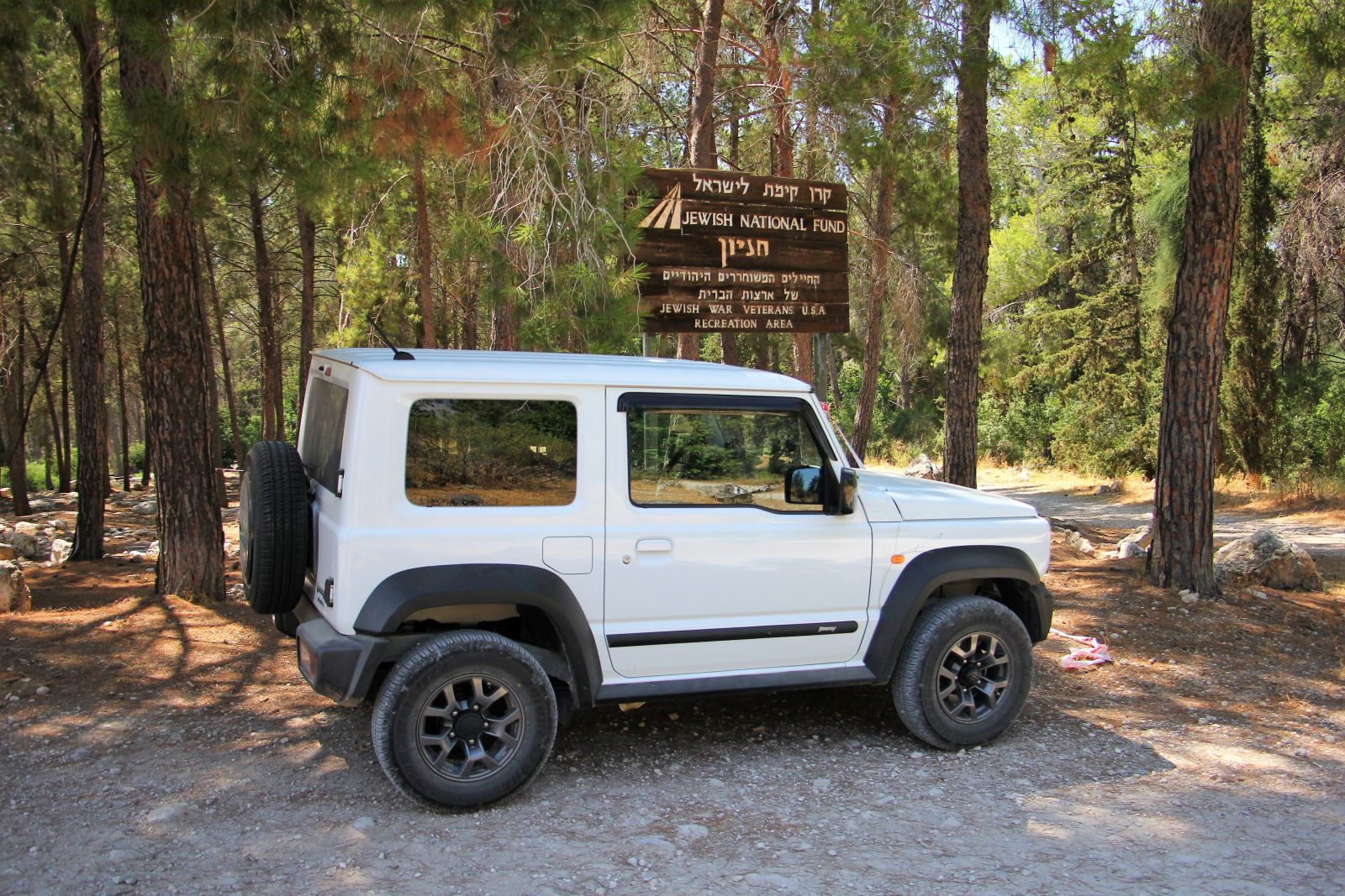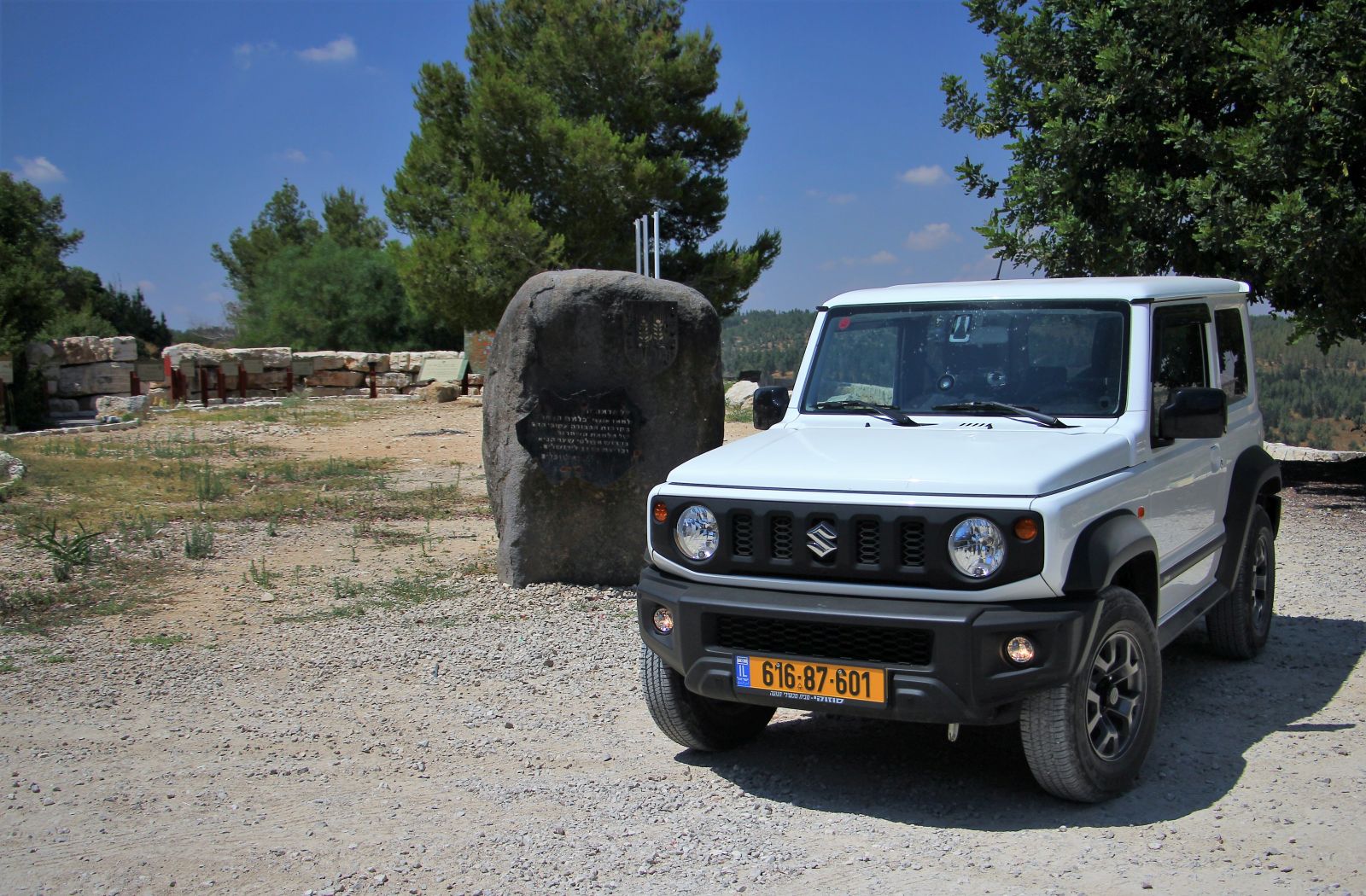 זה היה יום קיץ לוהט בחוץ, אבל בג’ימני הלבן המזגן המצוין השרה אווירה קרירה ונעימה. שילבנו להנעה כפולה ויצאנו לדרך על סימון השבילים האדום, כשלאחר זמן קצר הגענו להצטלבות דרכים. ניתן להמשיך ישר עם סימון הדרך האדום, אך אנחנו בחרנו לחתוך ימינה בעקבות סימון הדרכים השחור ולטפס על הגבעה המשקיפה על כביש 38, כשבפסגתה ישנה חורשה אנדרטה לזכר הנופלים מחטיבת הראל ובסמוך אליה חורשה לזכרם של המתנדבים האמריקאים שלחמו במלחמת השחרור. מקום אידאלי להוציא את ערכת הקפה מתא המטען של הג’ימני ולעשות עצירה קלה.